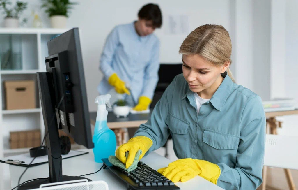 Desks, shared equipment, and common spaces tend to collect dust and germs quickly. A simple routine can prevent buildup and maintain a hygienic environment.